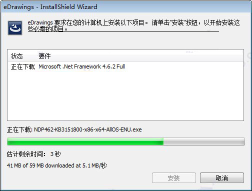 2、雙擊文件“eDrawingsFullAllX64.exe”安裝原程序,如果你的電腦沒有安裝.net 4.6.2組件,將自動下載安裝;