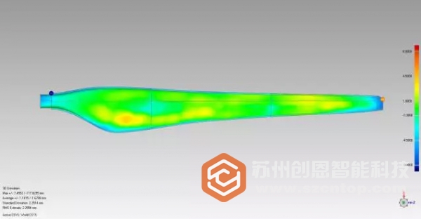 完成長(zhǎng)度超過(guò)7米的風(fēng)電葉片三維檢測(cè),并且出具3D檢測(cè)檢測(cè)報(bào)告。葉片是風(fēng)力發(fā)電機(jī)收集風(fēng)能的關(guān)鍵部件,其外形尺寸精度影響了整個(gè)機(jī)組的安全運(yùn)行。葉片成型質(zhì)量的好壞又取決于模具質(zhì)量的好壞,高精度的模具設(shè)計(jì)與制造技術(shù)是葉片氣動(dòng)外形的重要保證,對(duì)產(chǎn)品的生產(chǎn)效率、最終質(zhì)量和性能起著決定性作用。